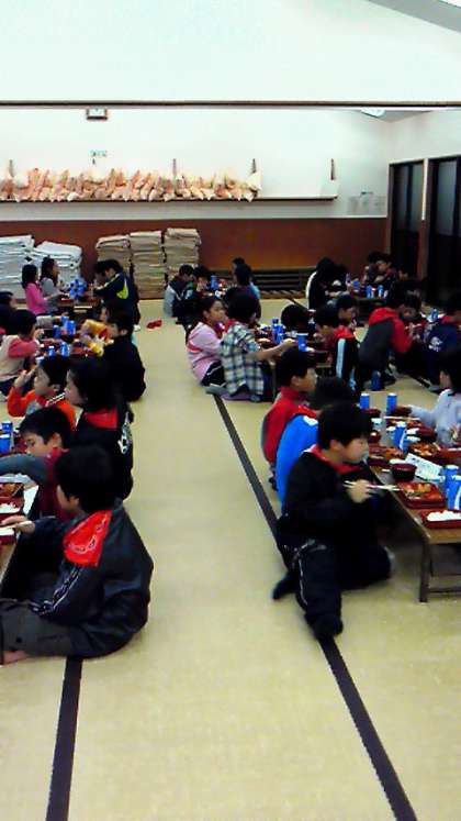90畳もある部屋で,みんな揃って夕食をとっています。この後のキャンプファイヤーが楽しみなようです。