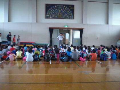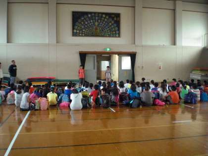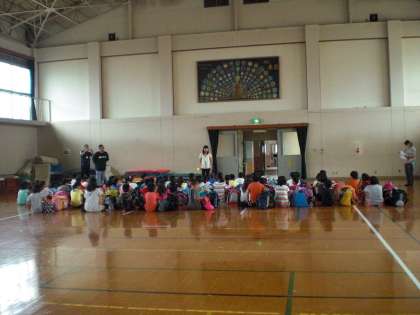5年生は,本日より奥越高原青少年自然の家での3泊4日の長期宿泊学習に出かけます。体育館で出発式を終えて元気に出発しました。