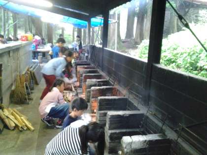 野外炊事が始まりました。かまどの準備をしています。