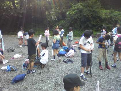 夜のキャンプファイヤーで使うトーチ棒作りの様子です。