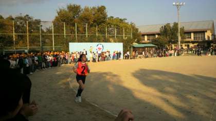 宇治川の河川敷を舞台に,大文字駅伝支部予選大会が開かれています。明親小学校の6年生チームは,今日までの練習の成果を発揮しようと,この大会に臨んでいます。現在は,8位とのこと,終盤の追い上げに期待しています。