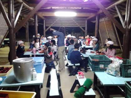 夕食が終わりました。次の活動はナイトウォークです。ナイトウォークの説明を聞いています。