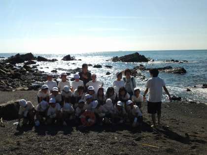 宮崎浜に到着しました。学級写真を撮ってから磯観察をします。