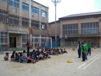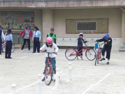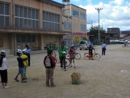 3年生が2時間目に自転車教室を行いました。伏見警察署の警察官の方やボランティアの方から,正しい自転車の乗り方について教えていただきました。