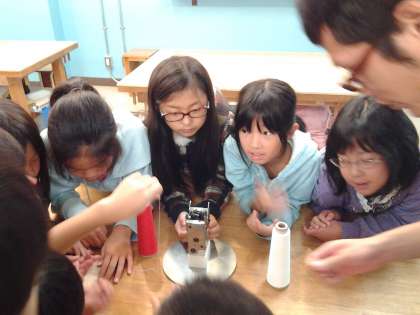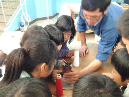 実際に糸を結ぶ作業を体験しています。とても楽しそうです。