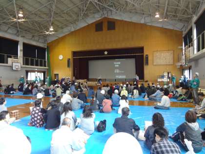 体育館にて,区役所の方の話を聞いています。