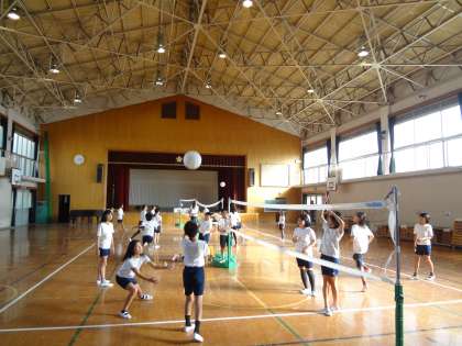 体育館でソフトバレーボールをしています。