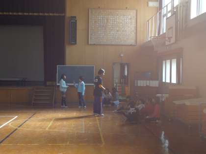 中間休み,代表委員の子どもたちが体育館で練習をしていました。