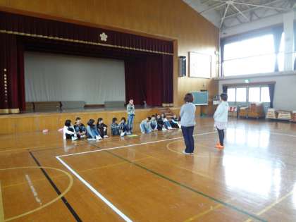 体育館では,ほけん委員会が明日の児童集会に向けて練習をしていました。