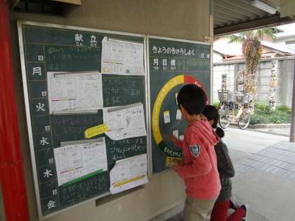 給食委員会の子どもが,栄養黒板の作成をしていました。