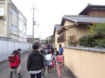 バスに乗る1・2年生の子どもたちは,教員引率のもと,集まってバス停へ行きました。
