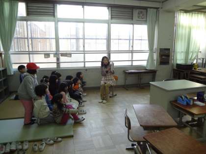 放課後まなび教室で,よんでよんさんの読み聞かせがありました。 子どもたちが静かに話を聴いていました。