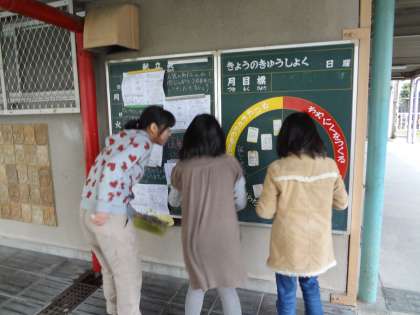 昼食後の様子です。 給食委員会の当番の子が献立黒板の作成をしていました。