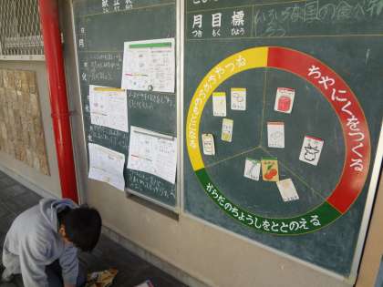 給食委員会の子どもが,栄養黒板の作成をしていました。