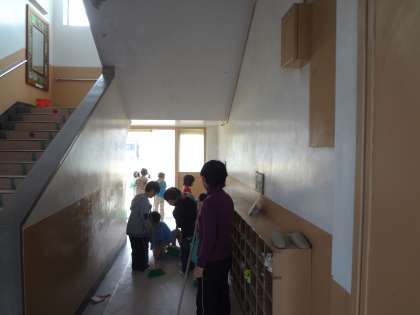 一年生が,階段下の廊下の掃除をがんばっていました。