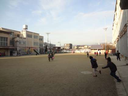 グラウンドでは,子どもたちが,鬼ごっこをしたり,長縄・一輪車で遊んだりしています。