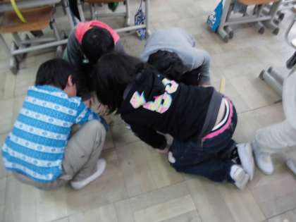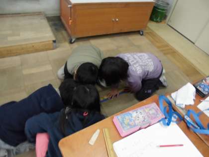 今日の算数の授業で紙テープを自分が1メートルと思うところで切り、誰のテープがメートルに一番近いかはかって調べました。一番近い子どもが1メートル3ミリで子どもたちから歓声が上がっていました。