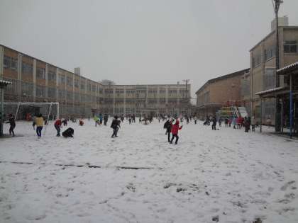 グラウンドで雪合戦を楽しんでいます。