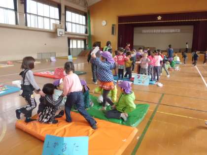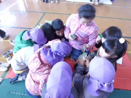 淀白鳥保育園の年長組36名が体育館で,本校の1年生と交流しました。