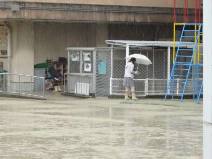 雨の中ですが,飼育委員会の子どもが飼育小屋の掃除をしていました。