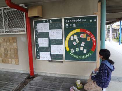 給食委員会の子どもが栄養黒板の作成をしていました。