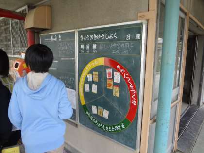 給食委員会の子どもたちが,今年度最後の献立黒板の作成をしていました。