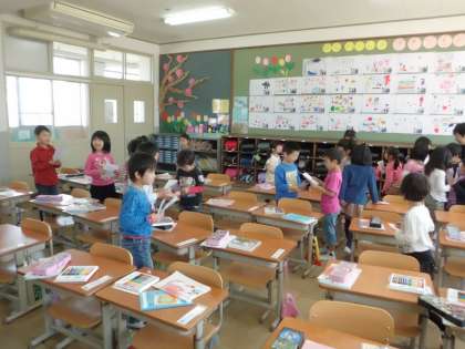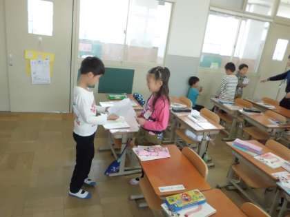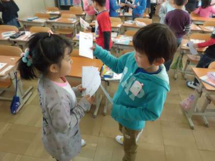 今日は国語の時間に表には名前,裏には好きな物の絵を描いたカードを友達と交換しました。手渡す時に,嬉しそうに自分の名前や好きな物を友達に伝えて,仲良くしてねと笑顔で会話を交わす姿がとても輝いていました。