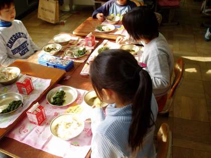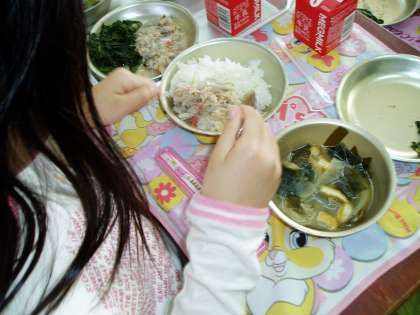 今日は新メニューの「カニずし」でした。子どもたちは,酢で味付けされたカニの身をご飯に混ぜていただきました。「美味しい。」という感想が多く聞かれました。