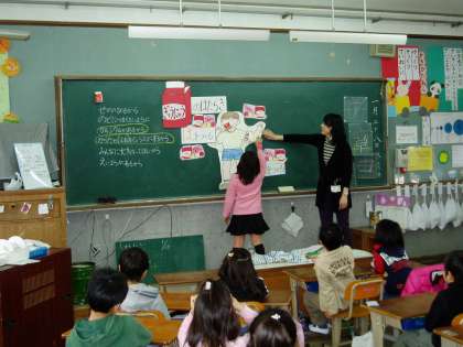 『牛乳』は,毎日,給食に登場します。1年生は,「なぜ,牛乳だけが,毎日,給食のメニューに登場するのか。」という疑問をもって,学習に取り組みました。指導は,本校の栄養教諭が,具体物を用いながら行いました。