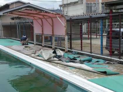 プールサイドのシートが古くなったため,あちこちでめくれたり,接着が剥がれて浮き上がって危険な状態でした。そこで,教育委員会にお願いして,新しいシートに張り替えていただくことになりました。今日は,まず古いシートを剥がす工程です。また随時,工事の様子をお知らせします。