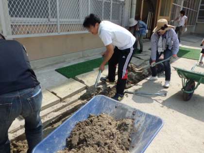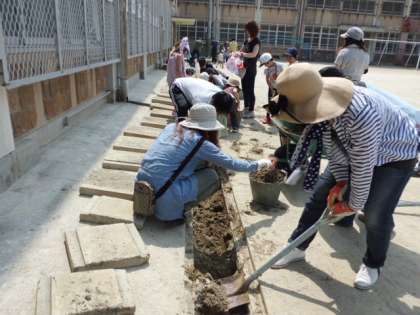 晴天の中,たくさんの方々に来ていただきました。校庭の側溝掃除は,湿った土を書き出し運びました。たくさんの土が雨で,流されて側溝は土でいっぱいになっていました。