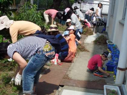 続いて,体育館裏の花壇の草取りもしました。たくさんの草でしたが,見違えるようにすっかりきれいになりました。