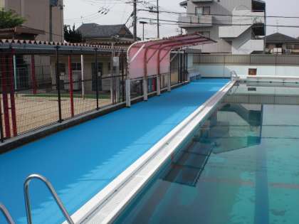 土曜日も炎天下の中工事は行われ,ようやくプールサイドシート貼り替え工事が完了しました。これで来週から始まるプール学習がきれいで安全なプールサイドで行えます。