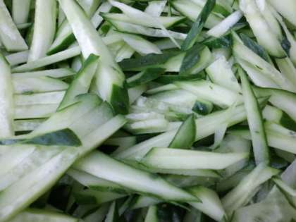今日は,にんじん・たけのこ・しいたけ・はるさめ…そして季節の野菜の「きゅうり」を使った「チャプチェ」が登場しました。