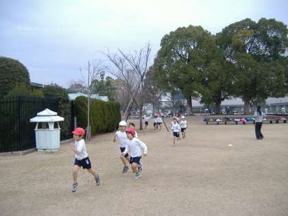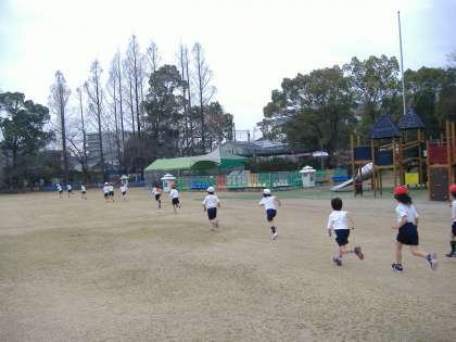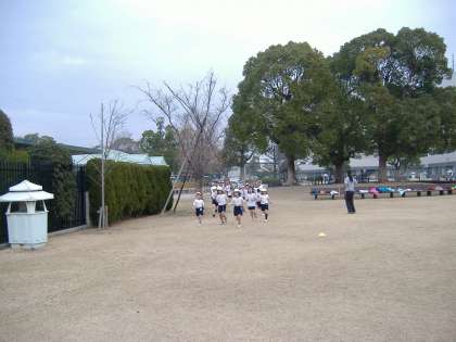 1年生は,持久走大会に向けて『みどりの広場』で持久走の練習をしています。今日は,大回りで2周走りました。みんな頑張ってますよ。