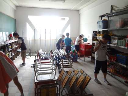 運動委員会の子どもたちが体育倉庫の掃除をしていました。