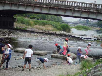 出町柳から少し歩いて,鴨川の亀石のところへ。「もう歩くのしんどい。」と言っていた人も,笑顔で,亀石をわたっていました。白鷺を見つけたり,川の合流しているところを復習したり,かわいい小石を見つけて名前をつけたりして楽しみました。