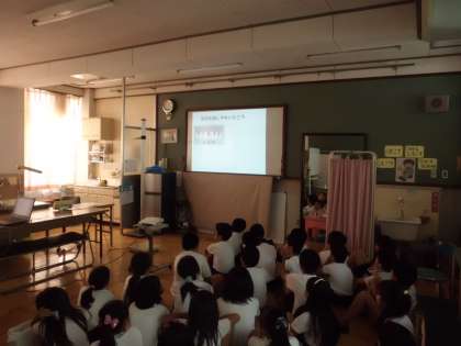 身体計測の前に,歯の健康について養護教諭の話を聞いています。