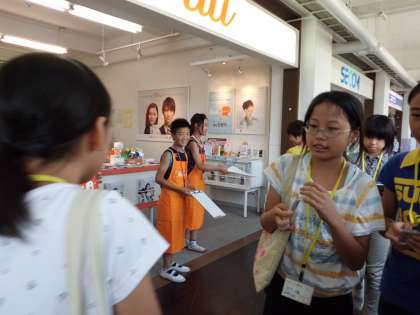 社内会議をそれぞれのブースで行い,自己紹介をしました。仕事内容を確認し,開店準備。ABCグループごとに交代で仕事とショッピングに分かれました。