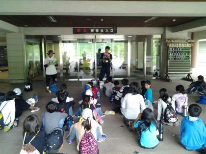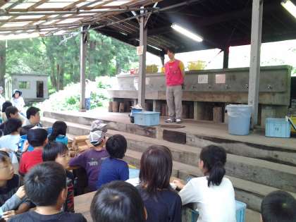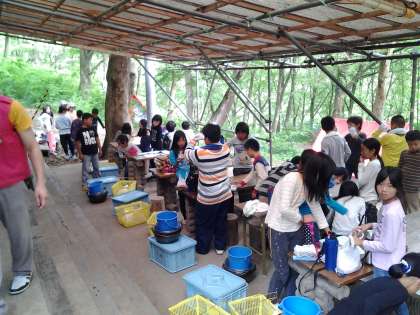 野外炊事が始まっています。所員の方から説明を聞いて,カレー作りの開始です。