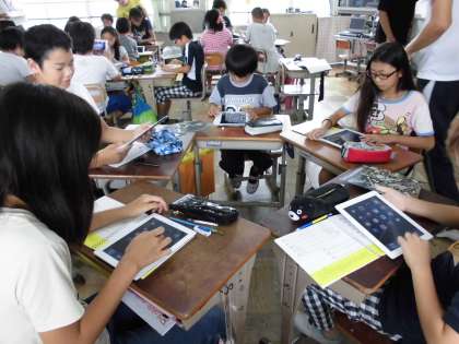 9月5日,5年生がiPadを使った体験型環境学習に取り組みました。これは,明親校区にメガソーラー発電を設置した(株)SBエナジーの企画により,実施されたエネルギー問題について考える授業です。子どもたちは,グループごとにiPadのプログラムに沿って,エネルギーの集め方や活用の仕方について意見を交流し合いました。
