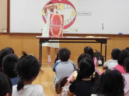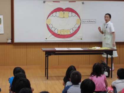 1年生が,歯の大切さや歯のしくみ,おやつの食べ方について,歯の上手な磨き方を教えていただきました。