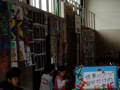 1年間の力作を体育館に展示し,友だちの作品の良いところを見つけ合っています。参観や懇談に来ていただいた保護者の方々も鑑賞してくださっています。