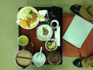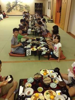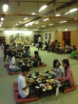 ホテルの大広間で豪華な食事です。みんな楽しく食べています。