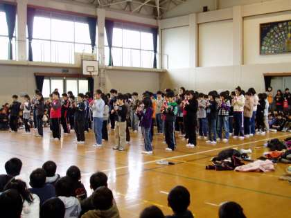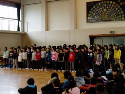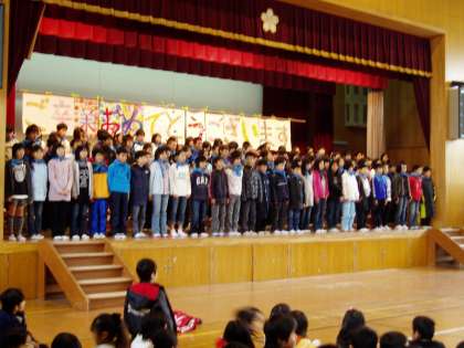 学年・学級から歌やメッセージをプレゼントし,6年生もそれに応え,歌をプレゼントしている場面です。