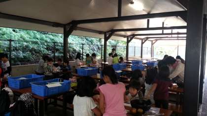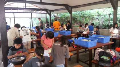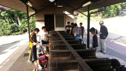 野外炊事が始まり,かまどの準備をしたり,野菜を切ったりしています。