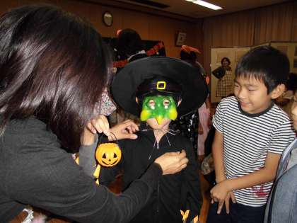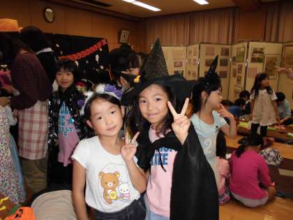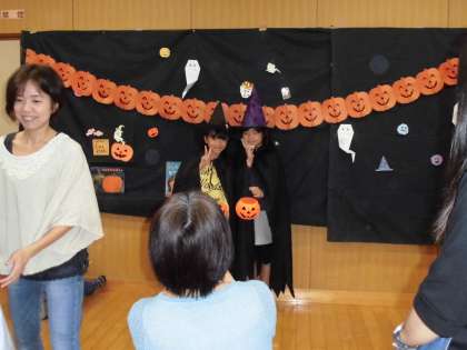 ハロウィンに関する仮装をたくさん準備していただき,帽子やマント,お面を着用して写真撮影していました。みんなとってもかわいかったです。