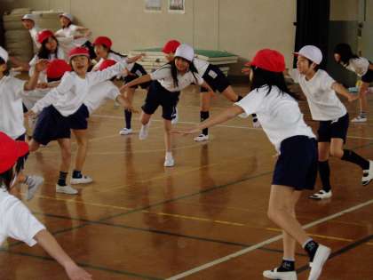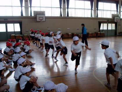 2年生体育 公開日 2010/03/12 更新日 2010/03/12 学校の様子 学習指導要領改訂に伴い,2年生の体育科に入ってきた「体ほぐしの運動」を経験している学習風景です。体力の低下傾向が問題になっていることから,低学年でもこの運動が取り入れることになりました。写真は,笛の合図がなるまでスキップを続け,合図と共に飛行機のポーズで静止するという動きと,その場で片足を軸に1回転した後にスキップで走るという動きです。子どもたちは,色々な動きを楽しんでいました。