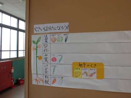 給食で野菜が登場するたびに,根・茎・実・花・葉を食べる野菜に分類しています。