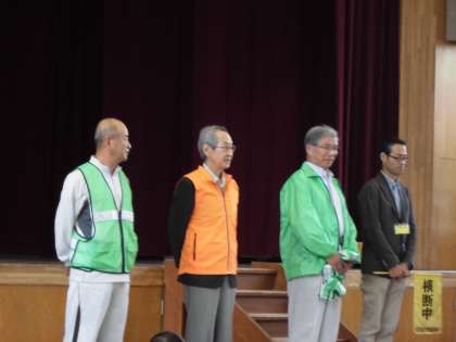 今日,伏見防犯推進委員協議会(淀支部)・伏見淀民生児童委員協議会・淀交通安全推進委員会・PTAの代表の方々が学校にいらしてくださいました。日頃よりお世話になっている「見守り隊」の紹介がありました。地域の方なので,たくさんの子どもたちが知っていました。